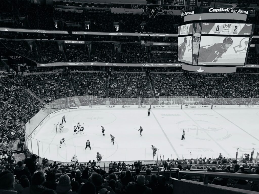 “Since the 18th century, ice hockey has evolved into a fast-paced competitive sport involving twelve players skating at high speeds on a sheet of ice and shooting a vulcanized rubber puck at speeds in excess of one hundred miles per hour. Played on a rink surrounded by hard wooden boards with players body checking each other as a defensive technique.”